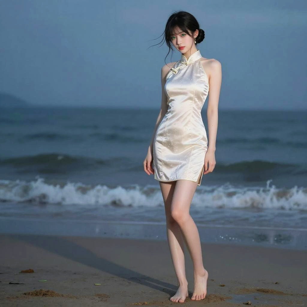 Random posture, (An extremely delicate and beautiful work), (masterpiece), 1girl, (Cheongsam attire:1.7), (full body showing legs:1.7), (show feets:1.7), cute, narrow waist, very thin legs, highly detailed, waist leaking, ponytail contorted, charming expression, beautiful and clear eyes, green eye pupil, delicate necklace, delicate earrings, simple blurred background, extreme detail description, beautiful, charming, ultra-fine painting, delicate face, delicate figure, Fine collarbones, lovely lips, beautiful breasts, soft behind, (8k, RAW photo, best quality, masterpiece:1.2), (realistic, photo-realistic:1.37), beach, night, rain, wet, professional lighting, photon mapping, radiosity, physically-based rendering
