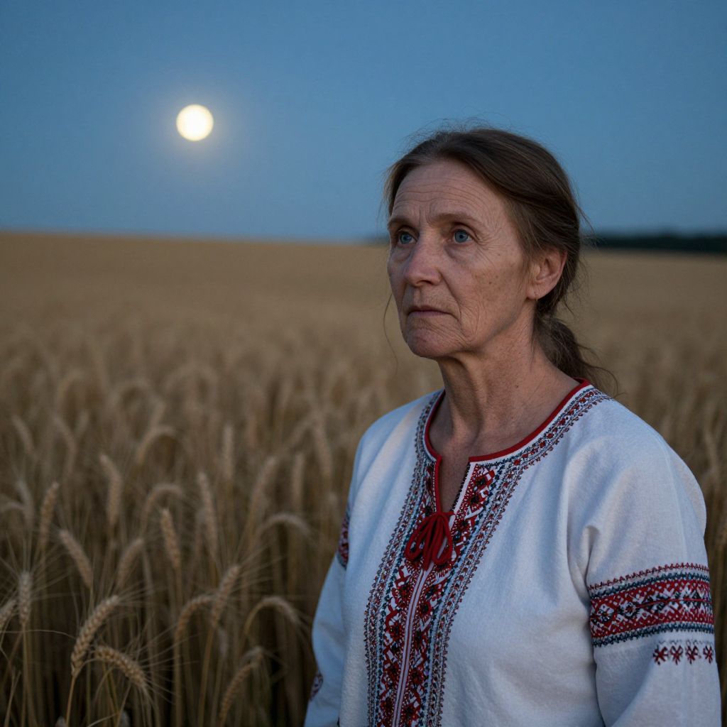 In a tranquil twilight scene, soft moonlight casts long shadows across vast fields of golden wheat. Amidst this serene landscape stands an old Slavic woman with experienced skin and timid blue eyes, her gaze fixed on something unseen beyond the frame. Her expression, a complex blend of wisdom, sadness, and longing, is captured from an unusual vantage point—as if through the lens of a hidden insect—revealing timeless beauty and stories etched in every line of her face. Enveloped in mystery, she invites viewers to uncover her secrets.