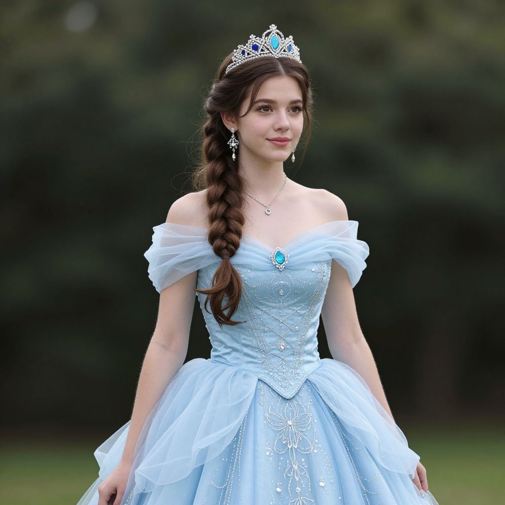 Princess aurora dress adult, 1girl, solo, dress, long hair, brown hair, tiara, blue dress, princess, realistic, bare shoulders, earrings, off shoulder, jewelry, braid, gown