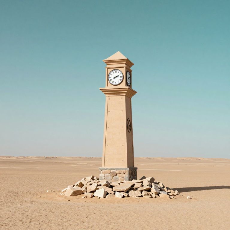 Lonely clock tower stands sentinel in a desolate desert, its base crumbling into a pile of jagged stones, as the vast expanse of sand stretches endlessly beneath a serene turquoise sky.