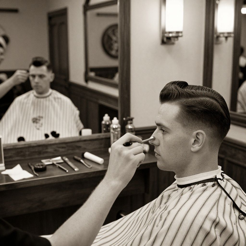 Hairstyle generator male, classic vintage barber shop scene, mid-20th century style with men sporting timeless pompadours and slicked-back looks, warm sepia tones, authentic barber tools and mirrors, nostalgic and detailed environment capturing the essence of the era