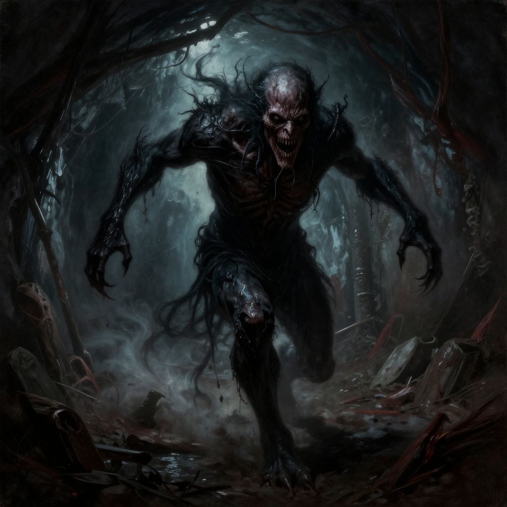 Creepy, extremely detailed, oil painting, action shot of terrifying beast eldritch with wet black skin chasing after the viewer in a decrepit underground tunnel in hell in the style of joshua hoffine and artgerm, unnerving, unsettling, terrifying, 80mm, horror lighting, dynamic action, detailed 4k horror artwork, undead lich, creepy hd 4k, horror cgi 4 k, horror image, scary color art in 4 k, hyperrealistic nightmare scene