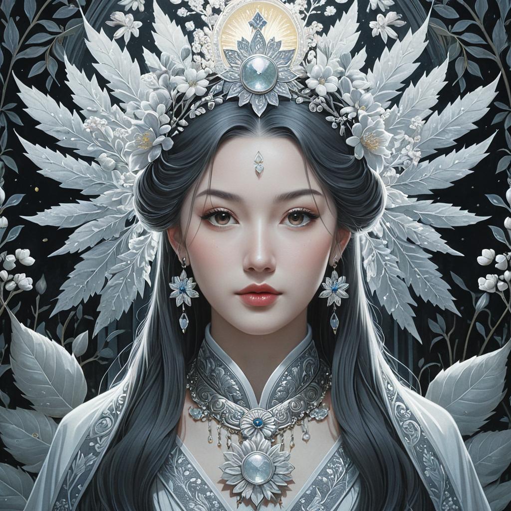 Breathtaking detailed concept art painting of goddess adorned with silver frost, orthodox saint with piercing eyes, ornate background, amalgamation of leaves and flowers, by Hsiao-Ron Cheng, Miho Hirano, Hayao Miyazaki, extremely moody lighting, 8k