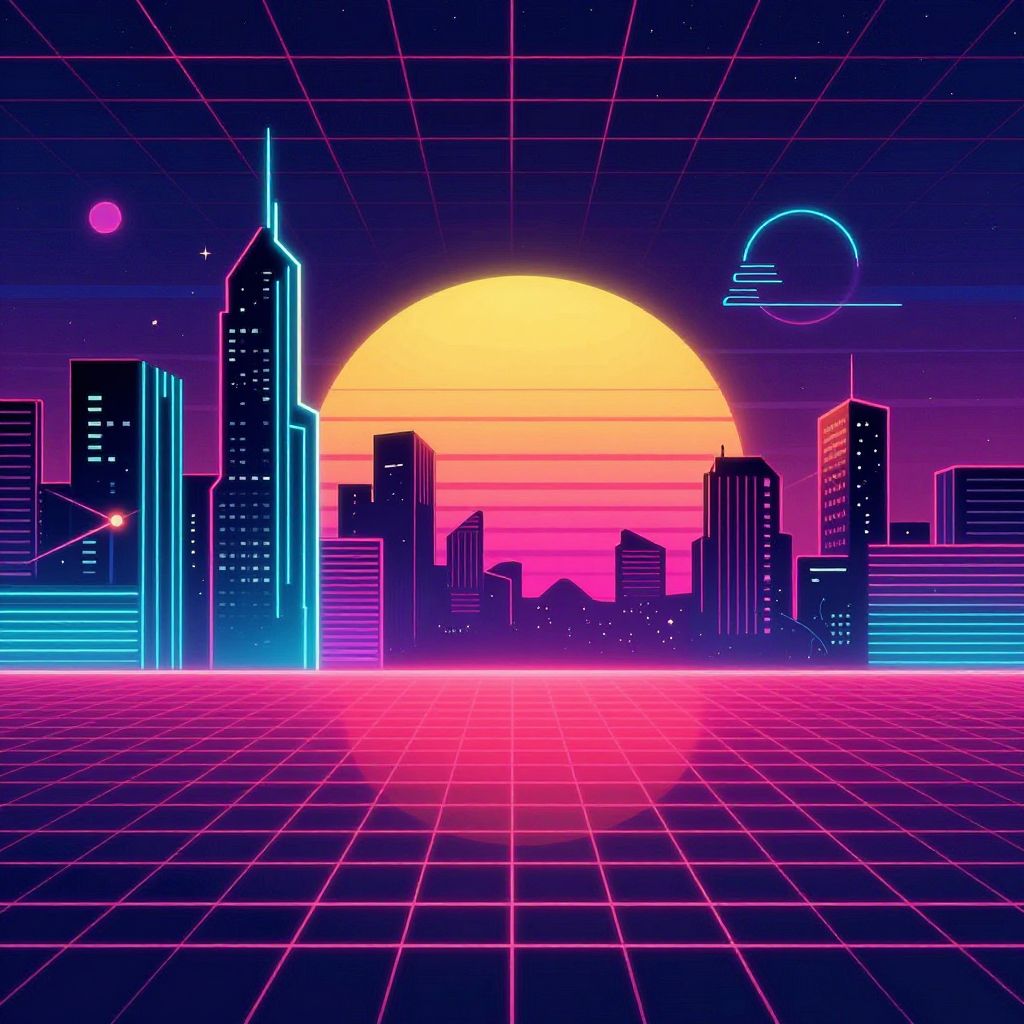 Retro 80s art featuring vibrant neon colors, geometric shapes, and glowing cityscapes, with a synthwave aesthetic and vintage grid lines stretching into a sunset horizon, capturing the nostalgic feel of 1980s futuristic design.