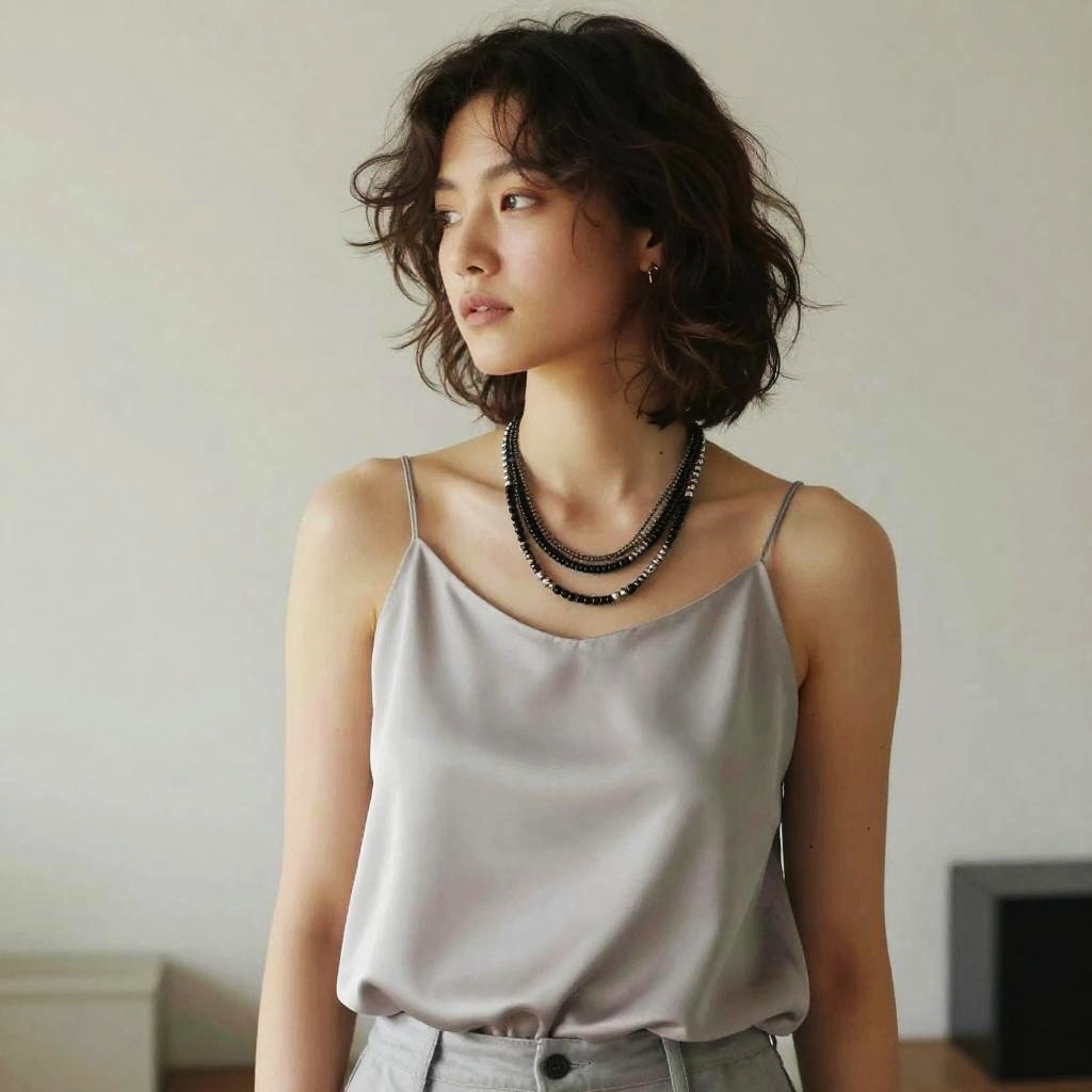 Woman, casual chic, sleeveless silk top in light gray, relaxed fit, off-shoulder straps, layered necklace with black and silver details, upswept voluminous hair with textured layers, neutral indoor background.