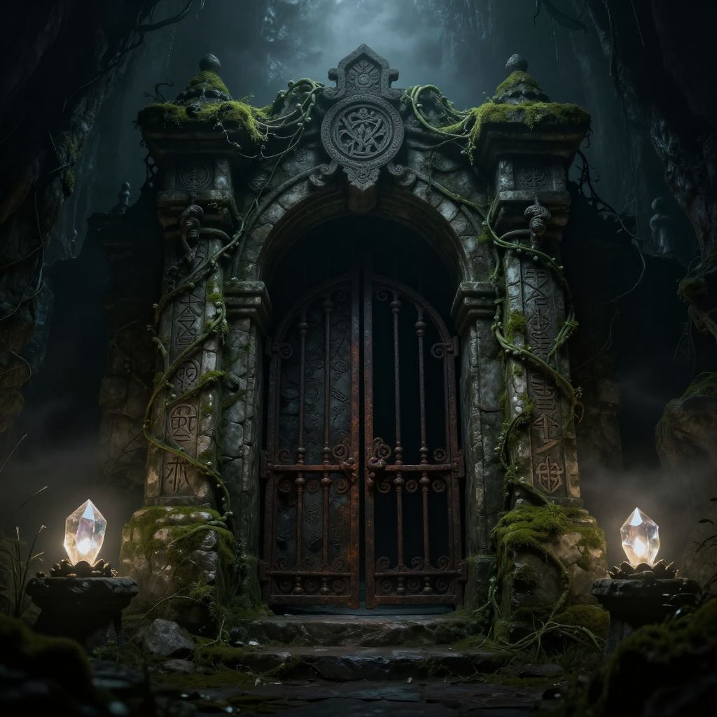 Fantasy dungeon art, a mysterious dungeon gate entrance covered in vines and ancient symbols, surrounded by ominous fog, glowing crystal orbs casting soft light, dark fantasy atmosphere, detailed textures on mossy stones and rusted iron, epic immersive scene