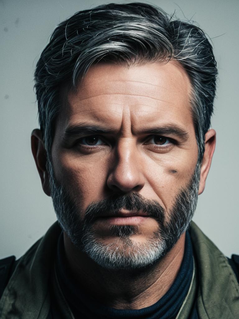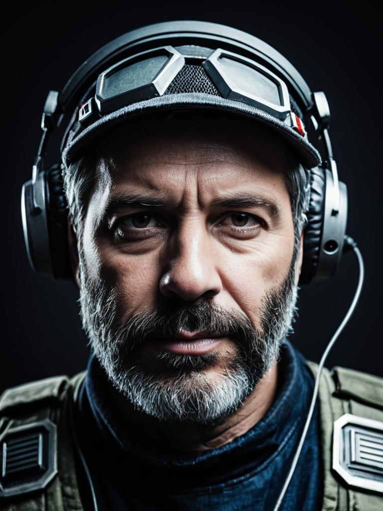 Close-up portrait of a middle-aged man dressed in a tactical operation game cosplay costume, featuring a military-style cap with goggles, large headphones, and a detailed vest. The man has a salt-and-pepper beard and intense facial expression, photographed in a studio with dark background and high photorealistic detail.