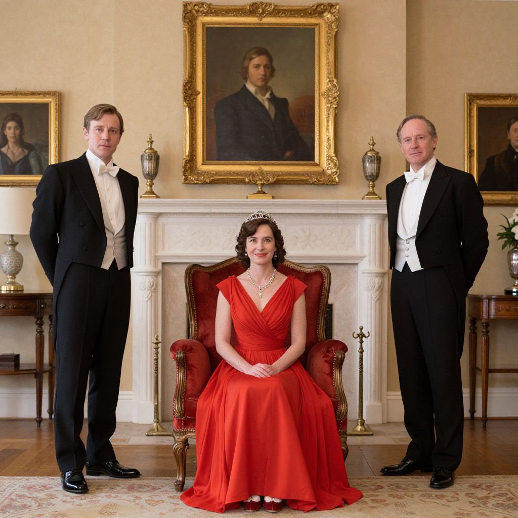 Elegantly dressed characters from *Downton Abbey* stand and sit in a luxurious parlor, with two men in tuxedos flanking a woman in a vibrant red dress seated on a plush red armchair, all positioned beneath a gold-framed portrait above a fireplace.
