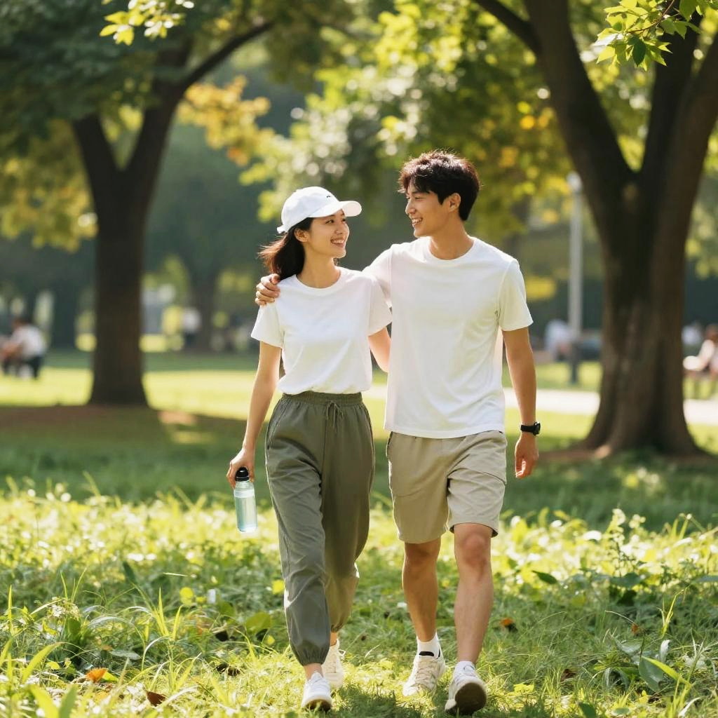 A happy man jogging in a park on a sunny day, surrounded by green trees and grass, wearing a beige t-shirt and sportswear, bright natural lighting, vibrant greens and warm tones, casual and relaxed atmosphere