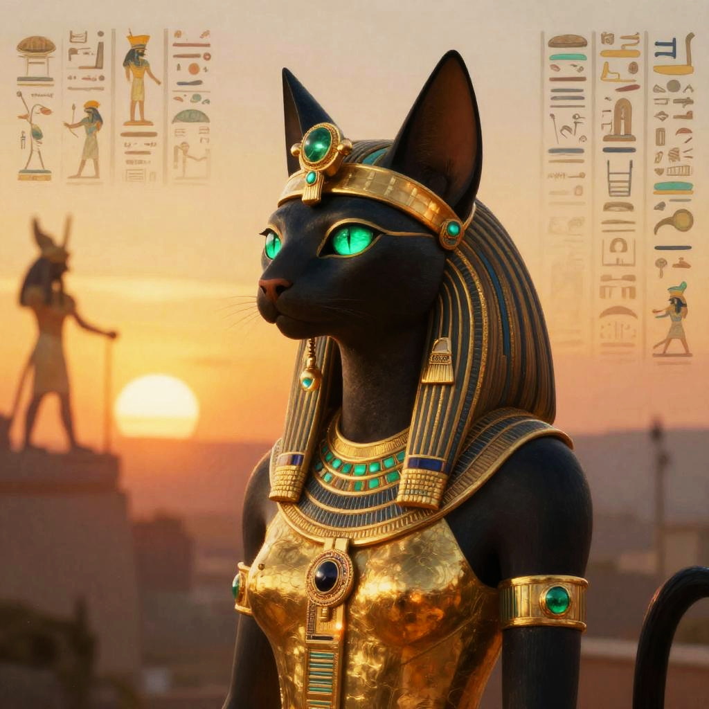 Beautiful Bastet goddess art, powerful yet graceful illustration of the cat goddess, ethnically accurate Egyptian features, vibrant jewel tones, intricate patterns on robes and jewelry, surrounded by glowing cats and mystical symbols, cinematic lighting, highly detailed digital art