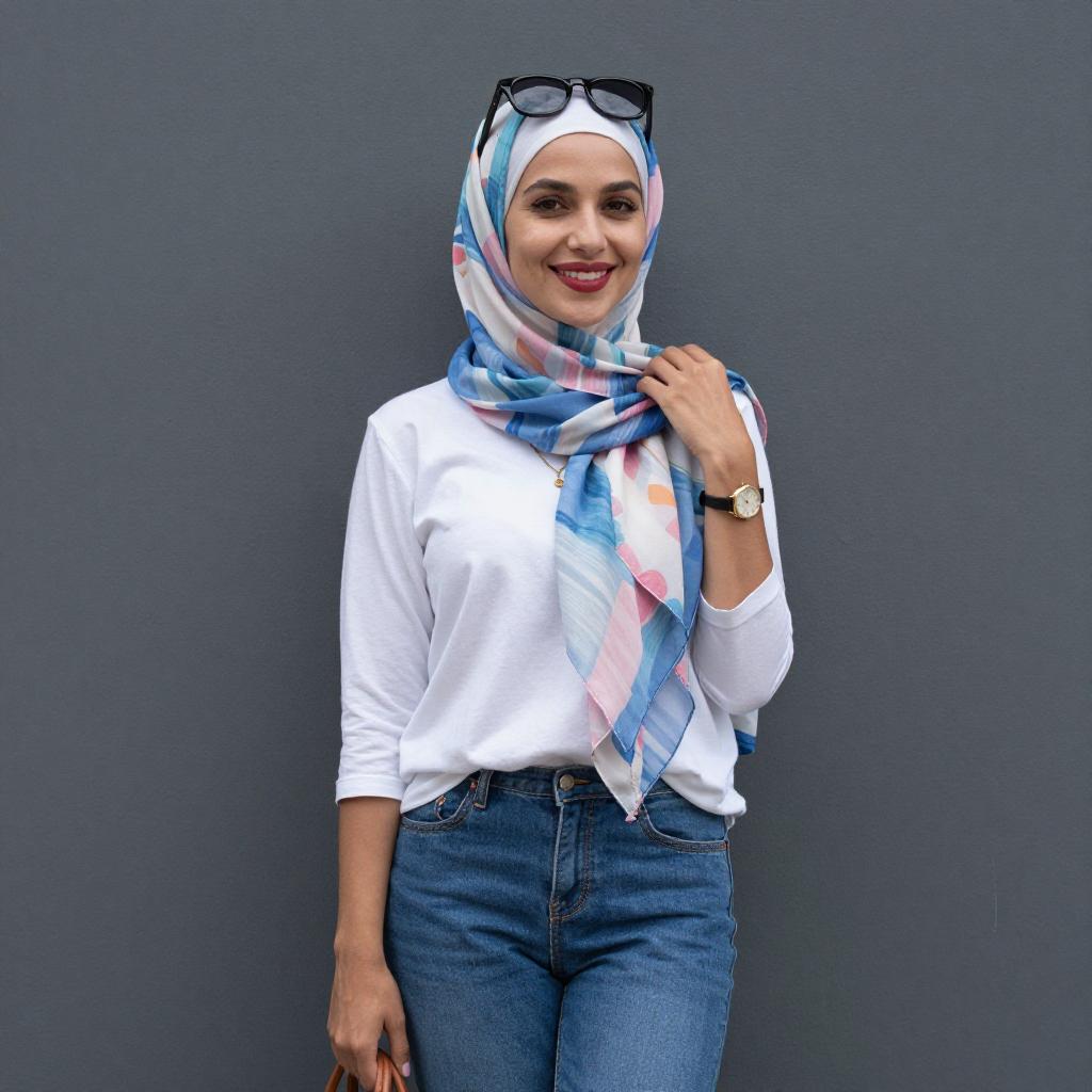 Photograph of a smiling woman with light skin and red lipstick, wearing a white long-sleeve shirt, blue jeans, and a colorful patterned hijab with blue, pink, and white hues. She has black sunglasses on her head, a gold necklace, and a wristwatch. She stands against a ured dark gray wall, holding a brown bag in her left hand.
