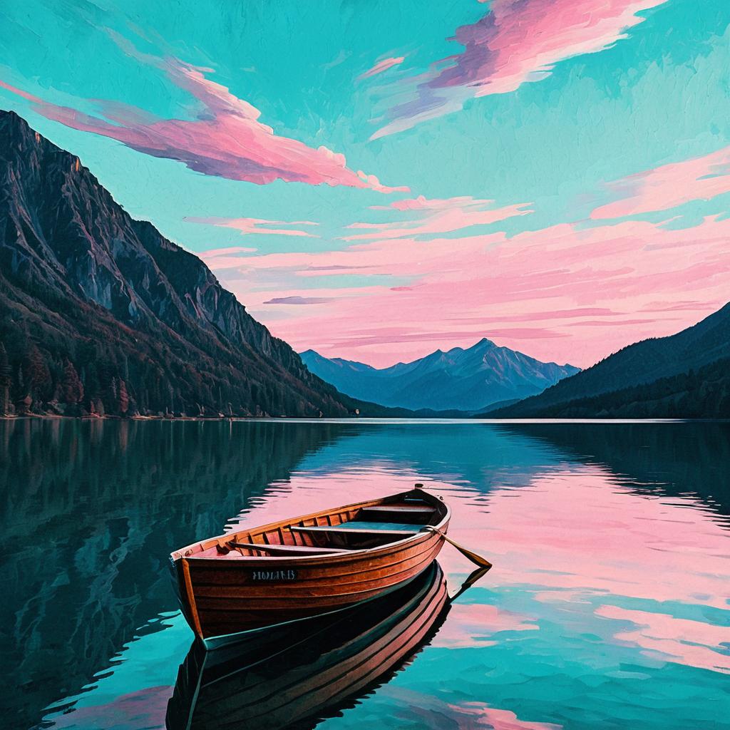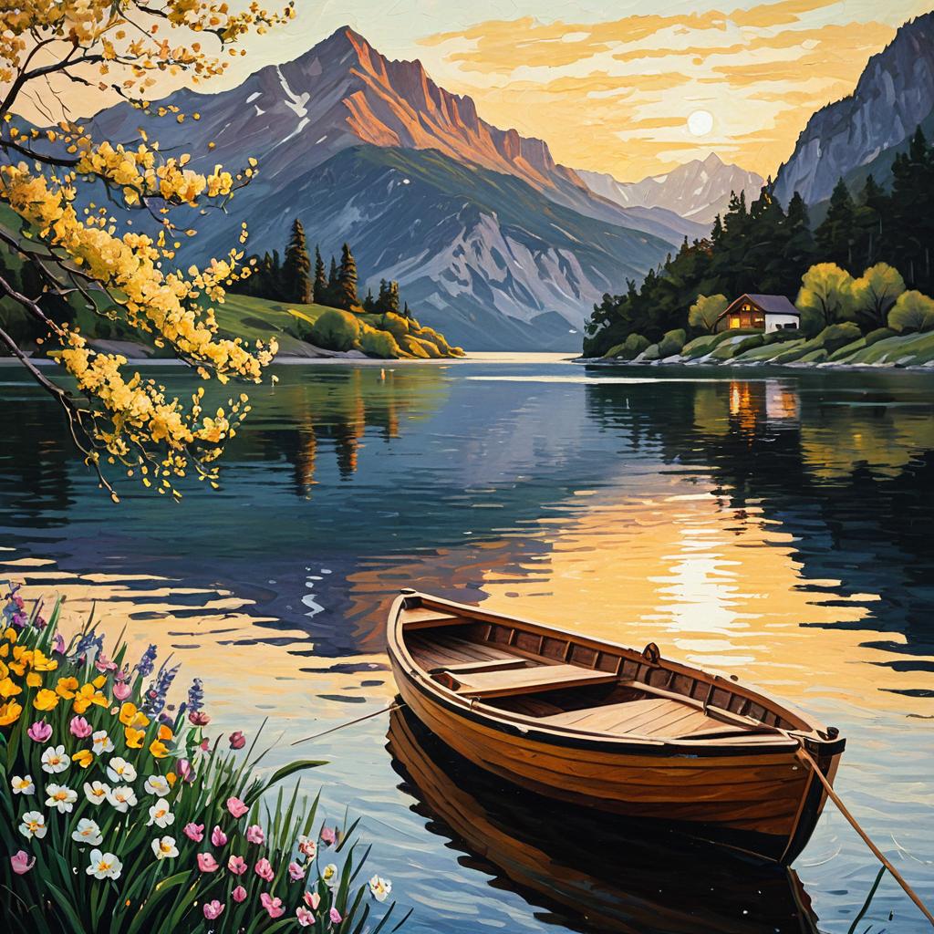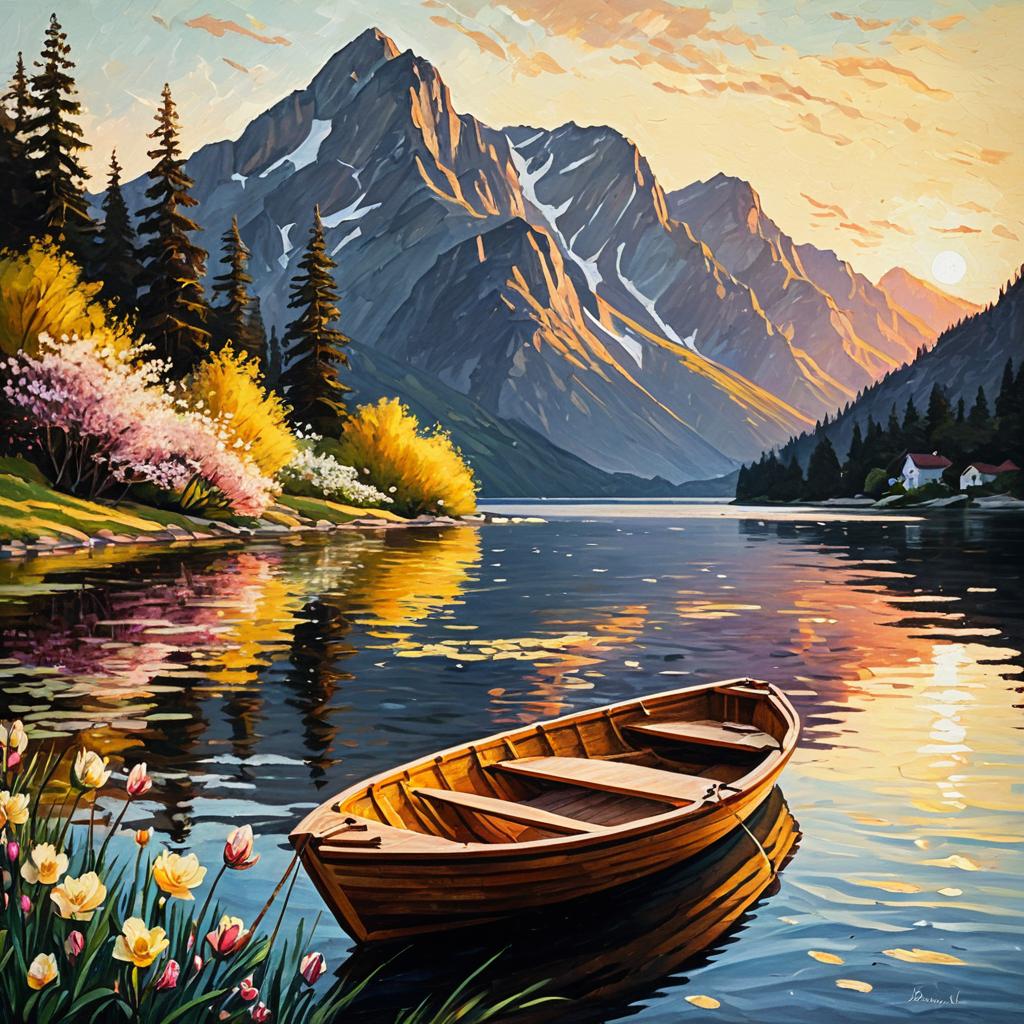 Impressionist oil painting of a tranquil mountain lake at sunset featuring a wooden rowboat floating on calm water. The scene includes vibrant spring flowers blooming on the shore and distant rugged mountains illuminated by warm golden light. Soft ripples on the water reflect the colorful sky with dynamic brush strokes.