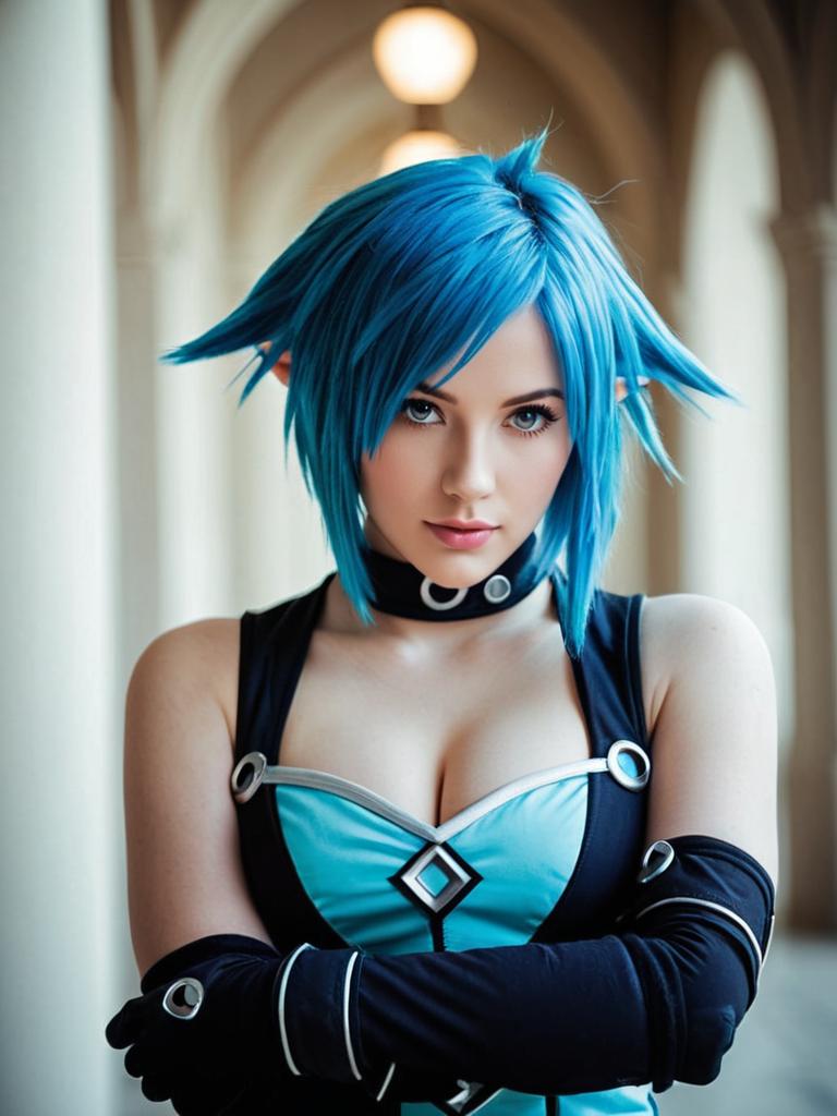 Photo-realistic cosplay photo of person in aqua (kingdom hearts) costume. 1girl, blue eyes, hair between eyes, blue hair, short hair, medium breasts, fingerless gloves, bare shoulders, detached sleeveslifestyle stock photo, shallow depth of field, lifestyle stock photography, shallow depth of field, natural lighting, warm tones, soft background blur, candid moments, vibrant colors, realistic textures, modern casual clothing. full body shot