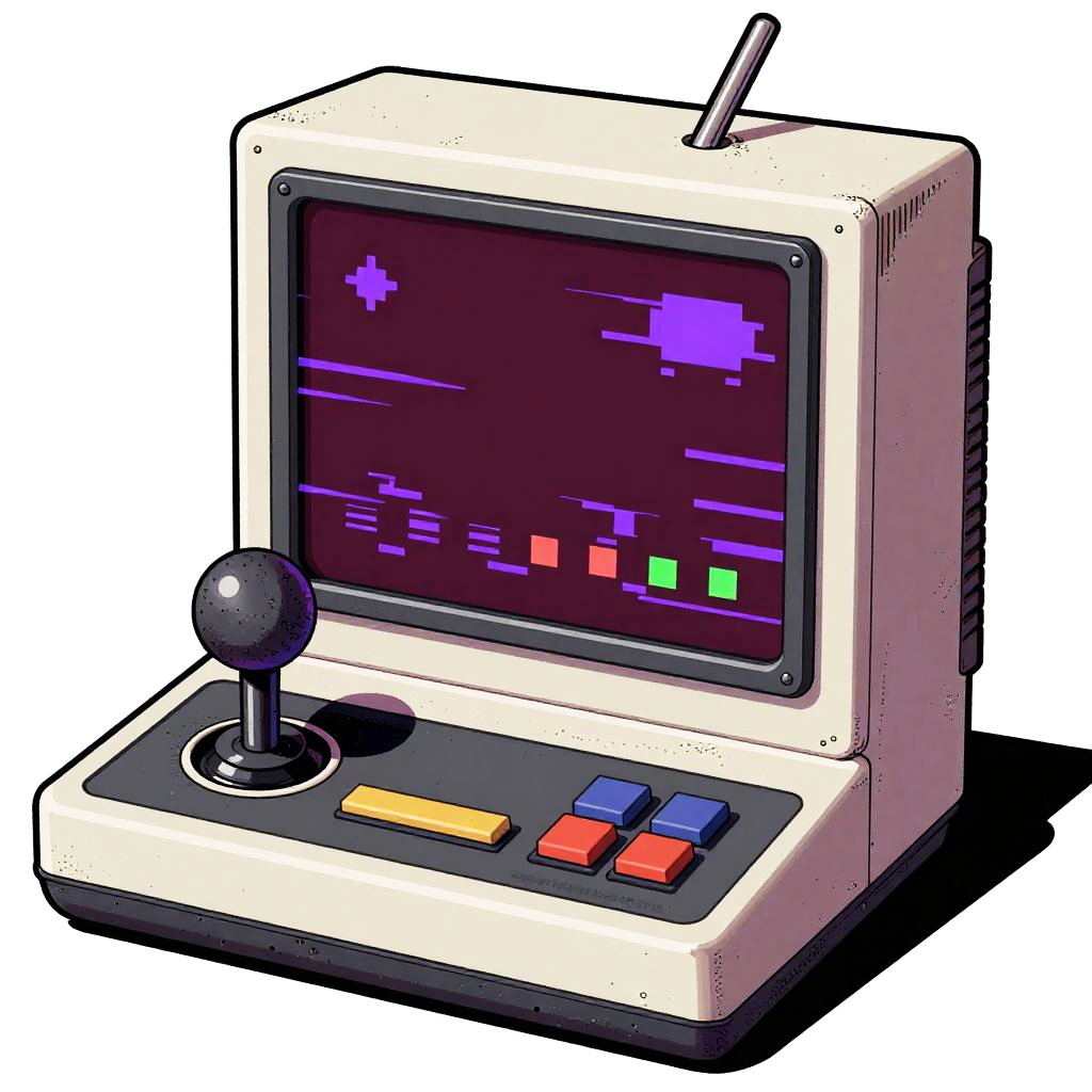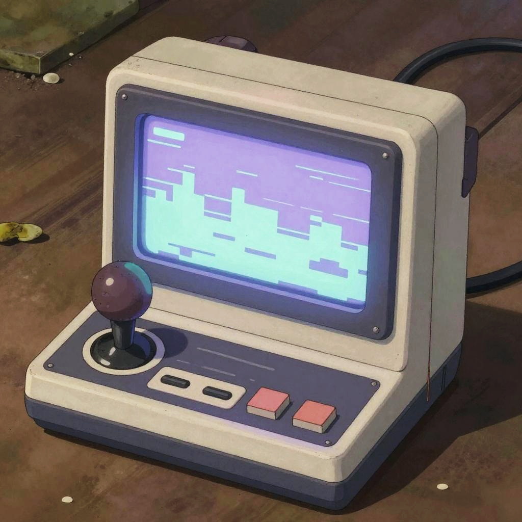 Italic A retro game console with glitching pixels, emitting maroon and lavender lights, bulky and rugged, with a worn-out trembling joystick, fluorescent, rugged, grungy, layered, high resolution, hand-drawn comic book style, in the style of Akira Toriyama