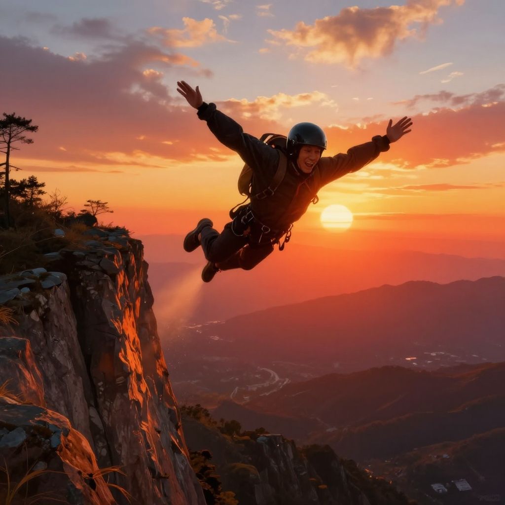 Style of Nobuyoshi Araki, a breathtaking high-definition digital painting artwork: a daredevil base jumper leaping off a towering cliff into a stunning sunset, arms outstretched, dynamic dramatic lighting, breathtaking aerial view, high adrenaline rush, pure euphoria, electrifying, thrilling, cinematic atmosphere, made in Photoshop, highly detailed, trending on ArtStation.