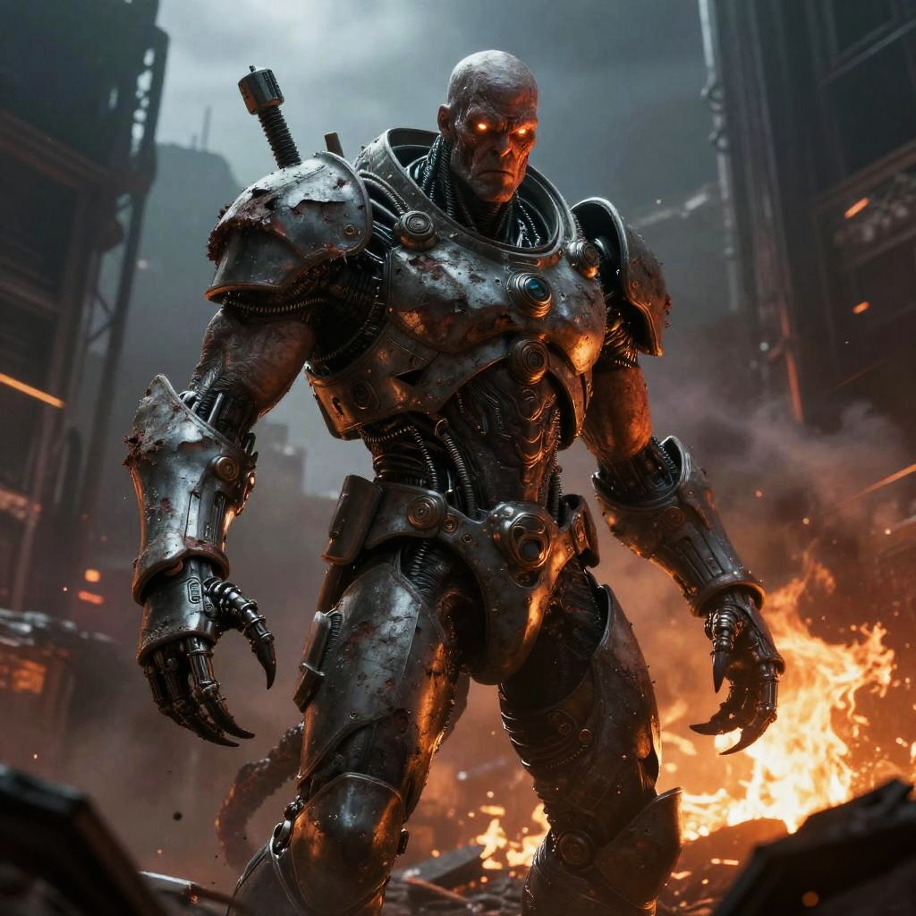 Bald monster in a post-apocalyptic cityscape, battered armor, cybernetic implants, intense glare, smoke and fire backdrop, dark sci-fi horror, highly detailed creature
