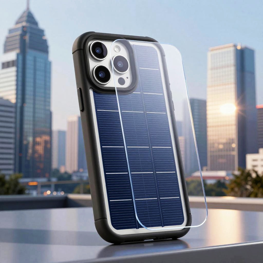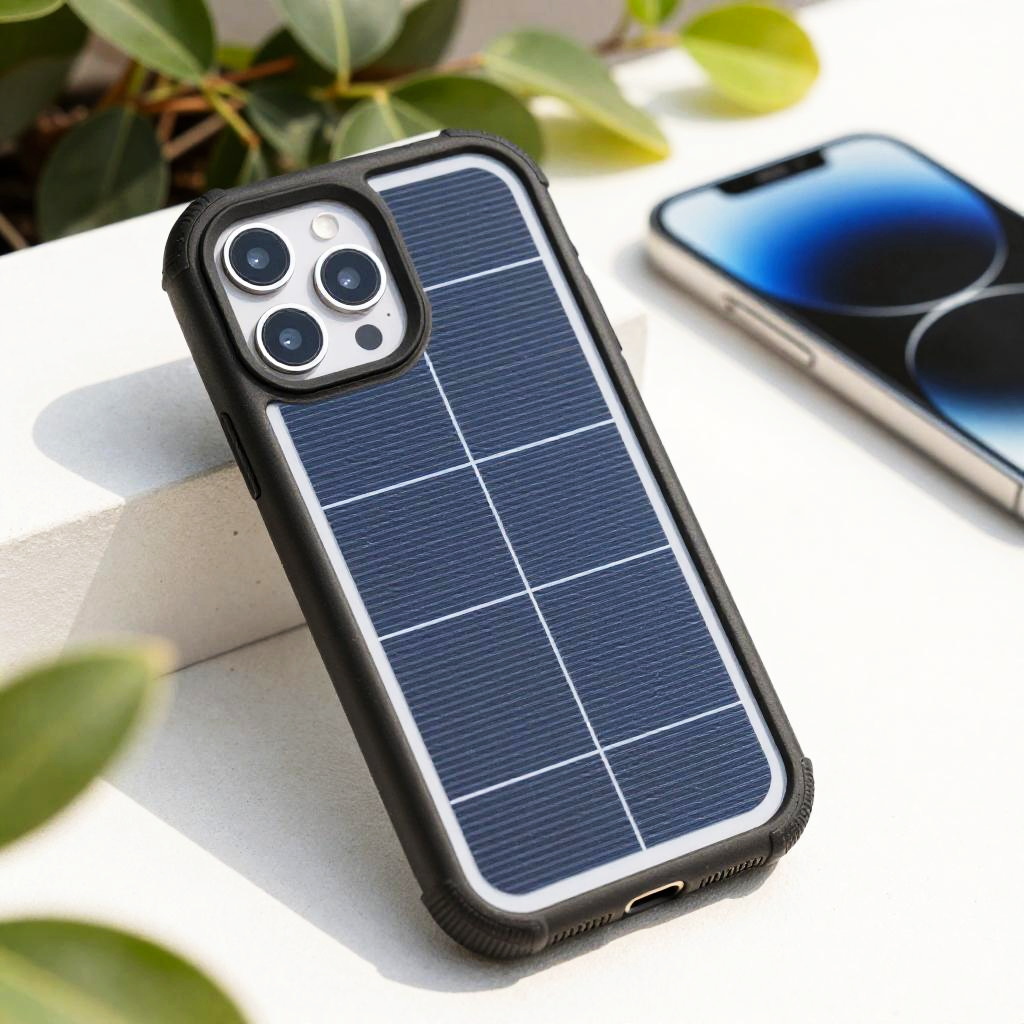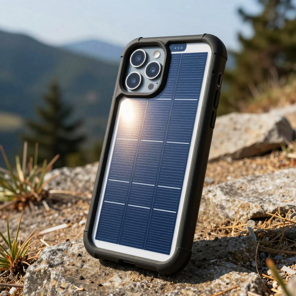 A solar panel iPhone case in use outdoors on a hiking trail, with sunlight glinting off the solar cells, the phone screen glowing, and nature elements like mountains and trees in the backdrop, emphasizing portability and eco-conscious technology.