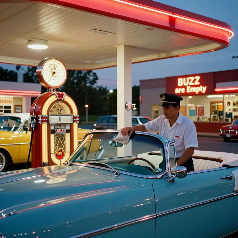A vintage 1950s gas station at twilight, with many classic cars parked by the pumps, The neon signs glow warmly reads \"BUZZ are Empty \", creating a nostalgic atmosphere, A friendly attendant in a uniform with a peaked cap is cleaning the windshield of a sleek, two-toned convertible while a jukebox inside the station plays rock 'n' roll hits
