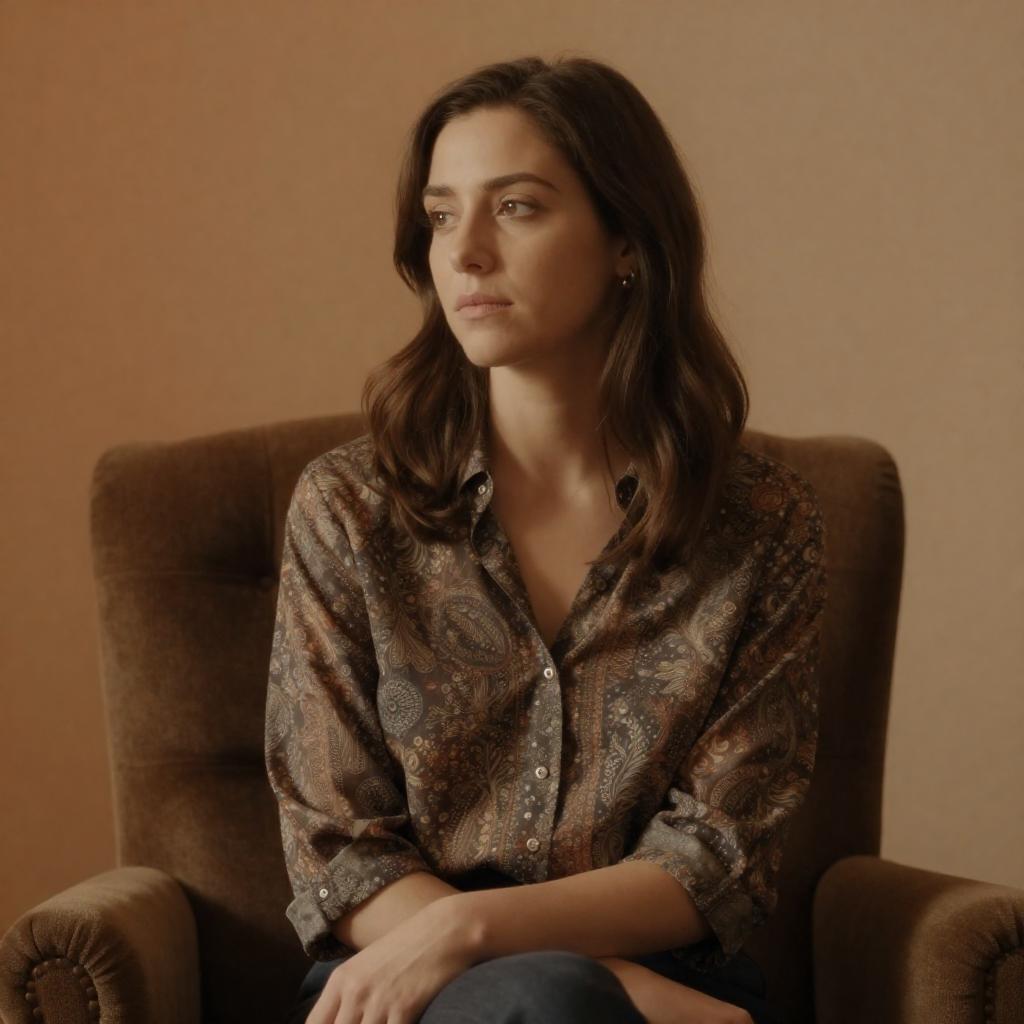 Close-up photograph of a woman with wavy brown hair, dark eyes, and neutral expression. She wears a dark jacket over a white shirt. Dimly lit background with a soft, circular light source. Shadows accentuate her face.