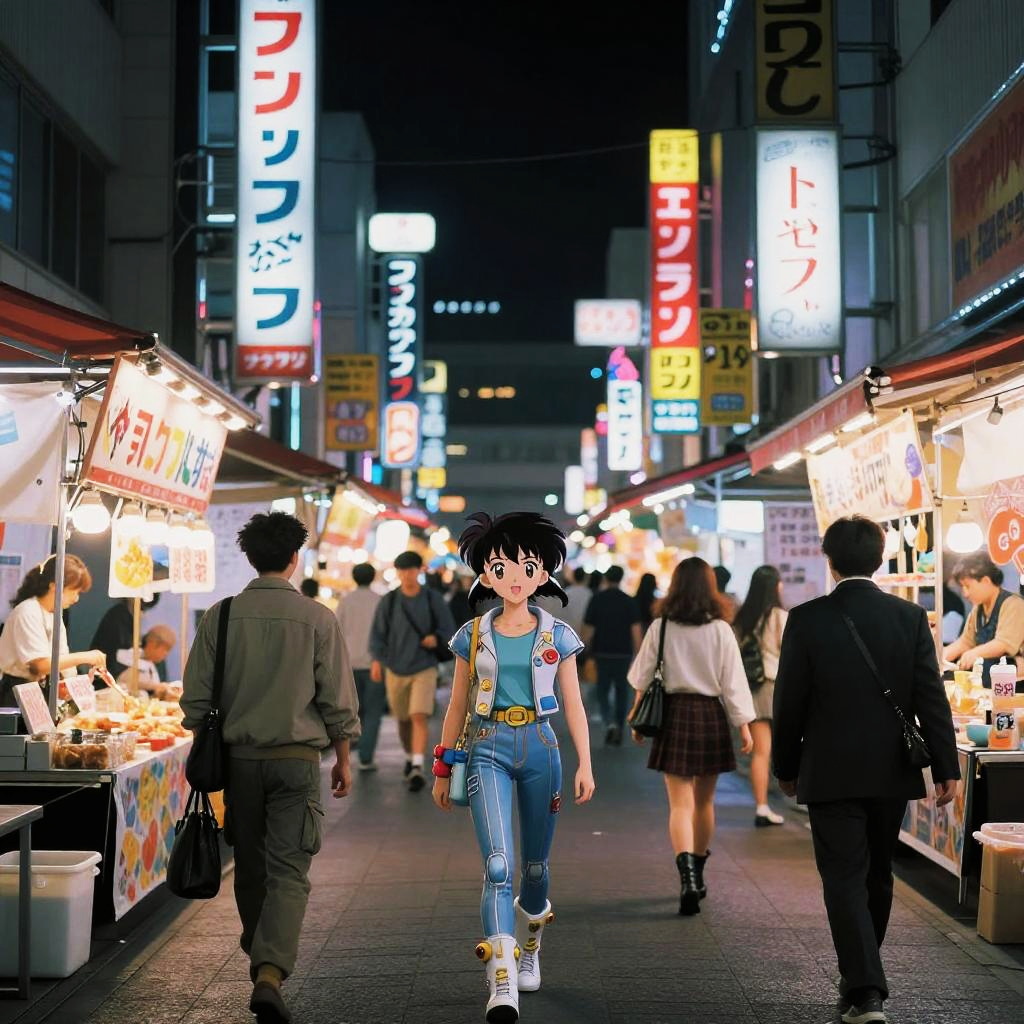 90s anime city market at night, lively stalls with neon lights, diverse crowd in vintage futuristic outfits, colorful signage in Japanese Kanji, misty ambient glow, nostalgic urban vibe