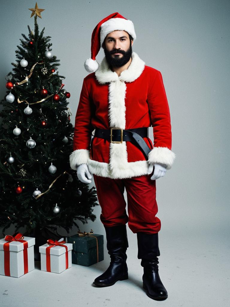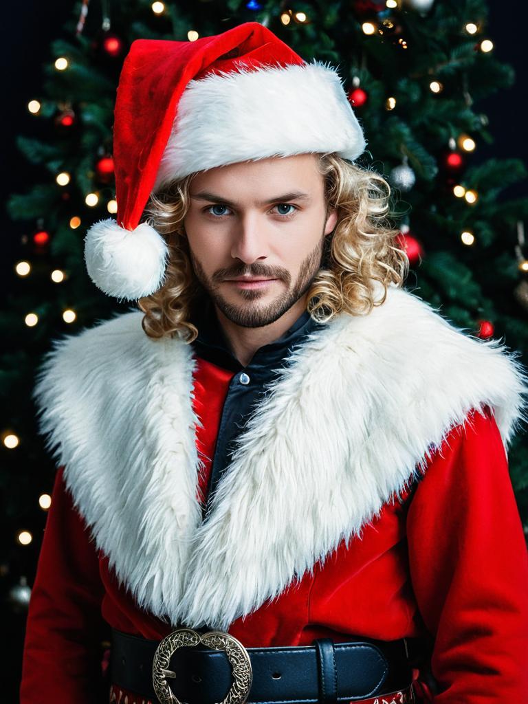 Portrait of a man wearing a Santa costume with a red hat, white fur trim, and intricate black belt. He has long curly blonde hair, a beard, mustache, and blue eyes. The background features a blurred Christmas tree with colorful lights.