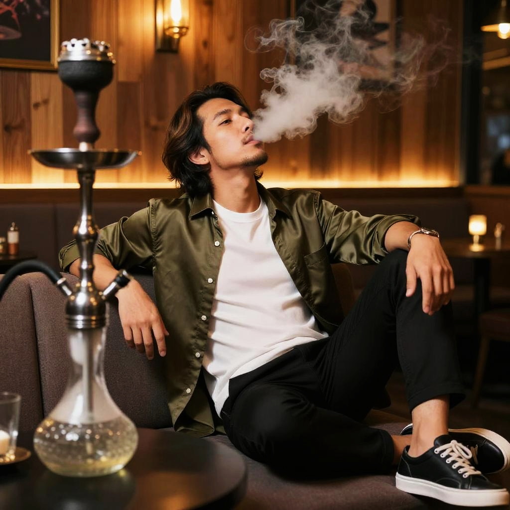 Man smoking shisha, adult man lounging in a stylish hookah bar, East Asian man with medium-length layered hair, soft stubble and high cheekbones wearing olive-green silk overshirt layered over a white crew-neck tee, slim black trousers and minimalist leather sneakers, leaning back against a sofa with head tilted upward, exhaling a long plume of smoke toward the ceiling, tall dark glass hookah standing on the table beside him, warm cosy lighting with wooden wall panels in the background, moody nightlife atmosphere, realistic photography, high resolution