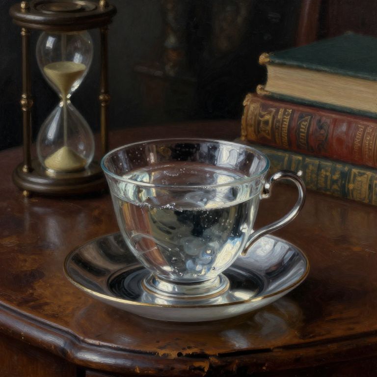 Photograph of a vintage scene featuring a transparent glass teacup and saucer filled with clear water, placed on a polished wooden table. To the left, an antique brass hourglass with sand running down is visible. Behind the teacup, two old, leather-bound books with ornate gold detailing are stacked. The background is dark, creating a contrast that highlights the glassware and books. The table's surface reflects light, adding a sense of depth and realism to the image.