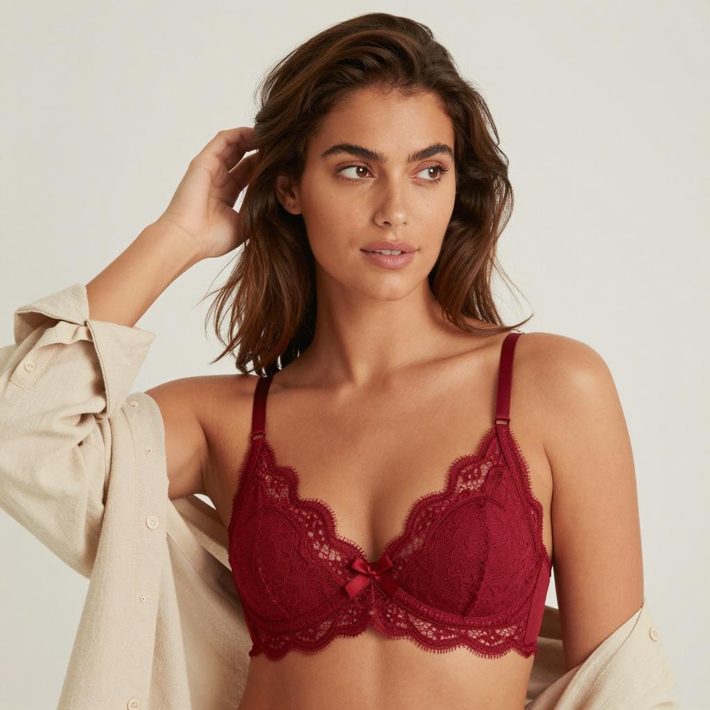 Woman wearing a flowing semi-sheer red lace nightdress with fitted lace bodice, slim straps and layered asymmetric chiffon panels, in scarlet lace with softly draping tulle on fair-skinned woman with smooth dark-brown bob and neutral lip posed leaning lightly against the wall with one arm behind her in classic apartment with high white walls and decorative trim, elegant yet airy nightwear photography, high resolution, ultra-detailed