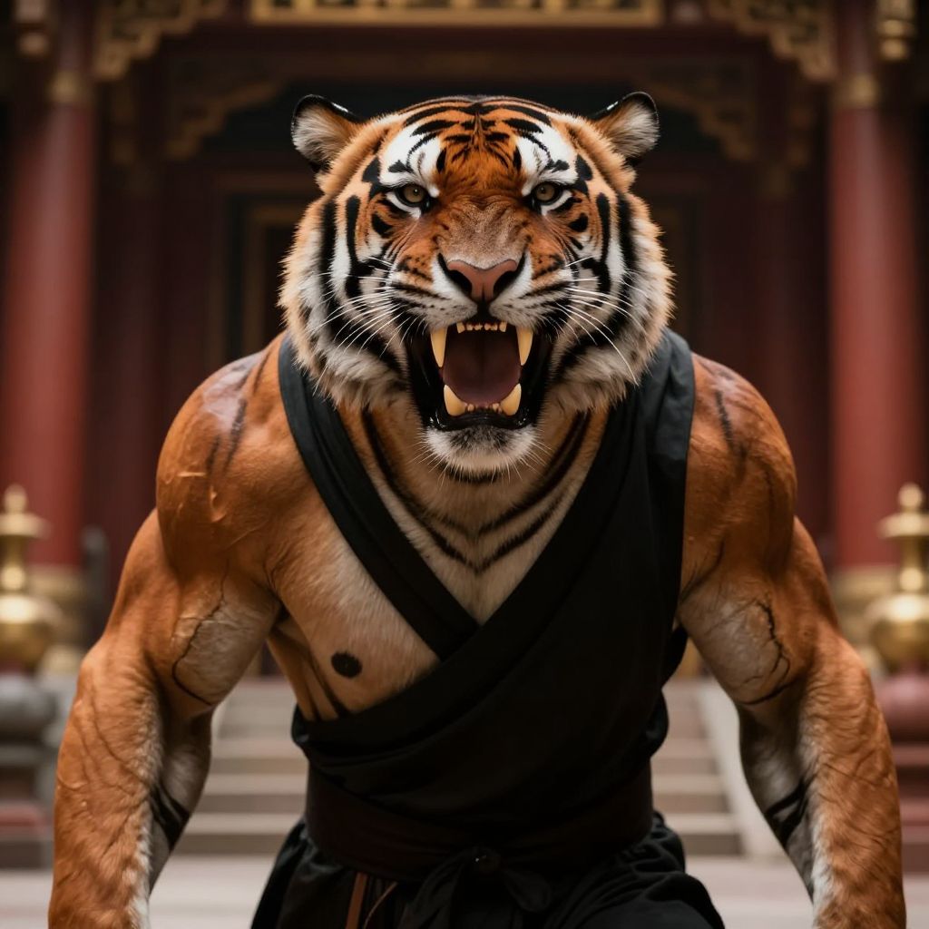 Digital artwork of a muscular anthropomorphic tiger with a human-like physique, standing in a traditional Chinese temple. The tiger's fur is orange with black stripes and white facial markings, and it has fierce, bared teeth and glowing eyes. It wears a black, sleeveless, wrap-style garment. The background features red columns and golden accents, with blurred temple steps leading to the tiger. The image has a high-contrast, realistic style, emphasizing the tiger's powerful build and intense expression. The lighting highlights the tiger's muscular definition and the textures of its fur and clothing.