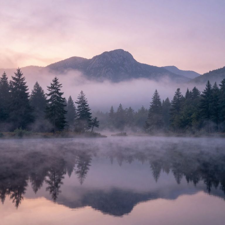 Northeastern landscape with dense pine forests covered in a light morning mist, a winding river reflecting the soft sunrise, cozy wooden cabins scattered among tall trees, birds flying gently in a pastel-colored sky, serene and peaceful atmosphere.