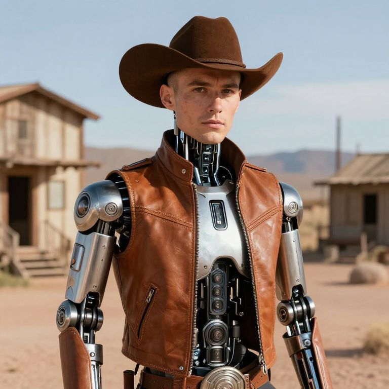 Fade sleek doc holiday cowboy robot looking at the camera,background is arizona ghost town .tan leather and magnesium,professional portrait,octane render,sports photography,