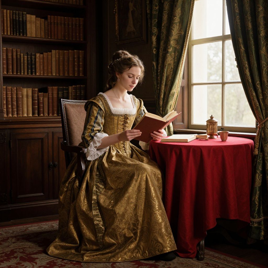 A woman dressed in a 17th-century gown sits by a window, engrossed in reading, surrounded by a richly detailed interior featuring dark wood bookshelves, warm golden-hour lighting, and a vibrant red tablecloth, evoking a classic, high-definition historical illustration.