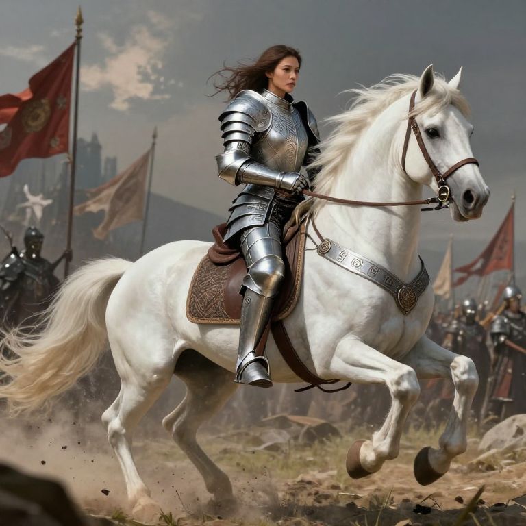 Armor fantasy, a heroic female warrior in polished plate armor engraved with ancient symbols, mounted on a majestic white stallion, charging through a battlefield with flags waving, epic composition, richly detailed background