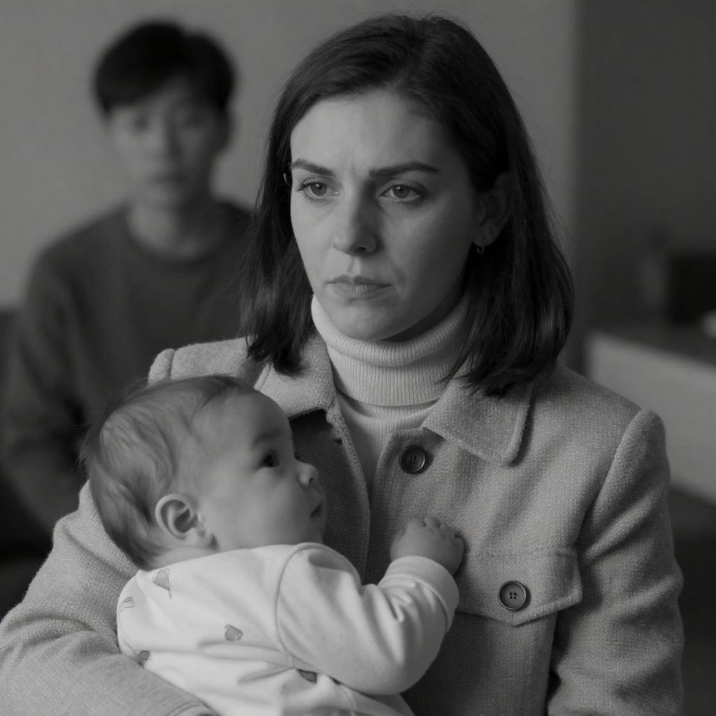 Black-and-white photograph of a woman with dark, shoulder-length hair, wearing a light turtleneck and a ured, buttoned jacket. She sits with a baby in her lap, cradling the baby's head with her right hand. Another person is partially visible in the blurred background. The woman's expression is serious and focused.
