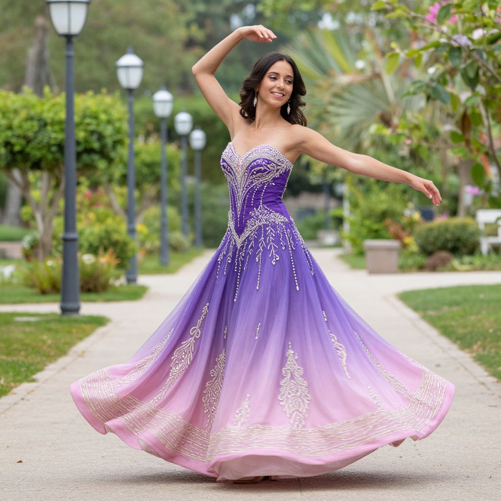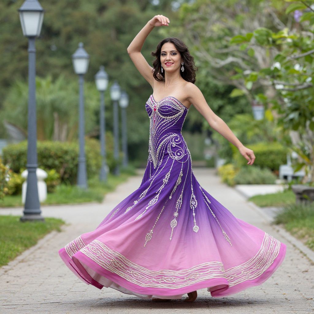 Photograph of a smiling woman with dark wavy hair, wearing a strapless, ombre purple to pink ball gown adorned with white lace-like patterns. She is dancing gracefully with one arm raised and the other extended, standing on a paved path in a lush, green garden. The background includes blurred lampposts, bushes, and trees. The dress's skirt flares out, highlighting its full, elegant form. The overall scene is bright and vibrant, with a sense of movement and joy.