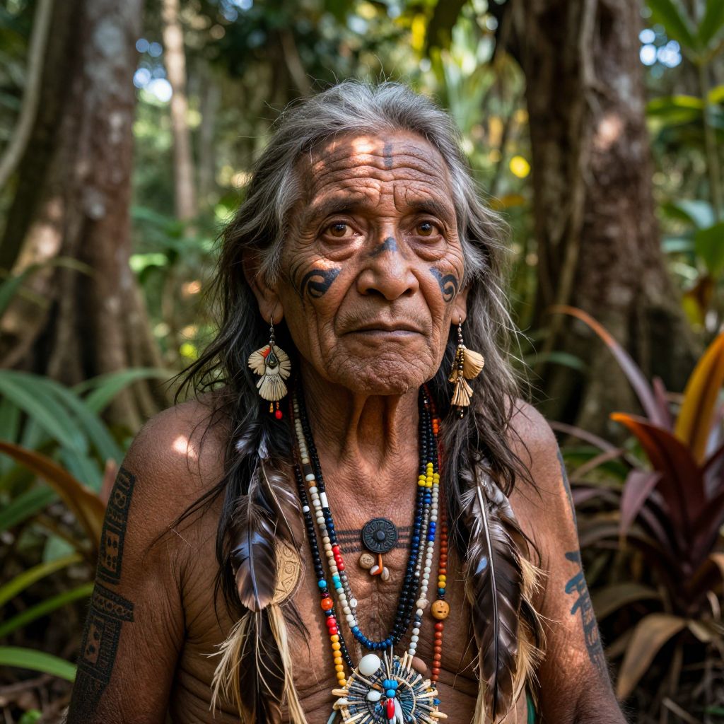 Photograph of an elderly Indigenous man with deep wrinkles and sunken eyes, standing in a lush, tropical forest. He has long, grey hair with black streaks, adorned with feathers and beads. His skin is dark brown, and he has black paint on his cheeks. He wears large, ornate earrings, a necklace with colorful beads and a large black disc, and has tattoos on his arms. The background is blurred with green foliage and tree trunks, creating a natural, jungle-like setting. The image is vibrant with rich colors and detailed textures.