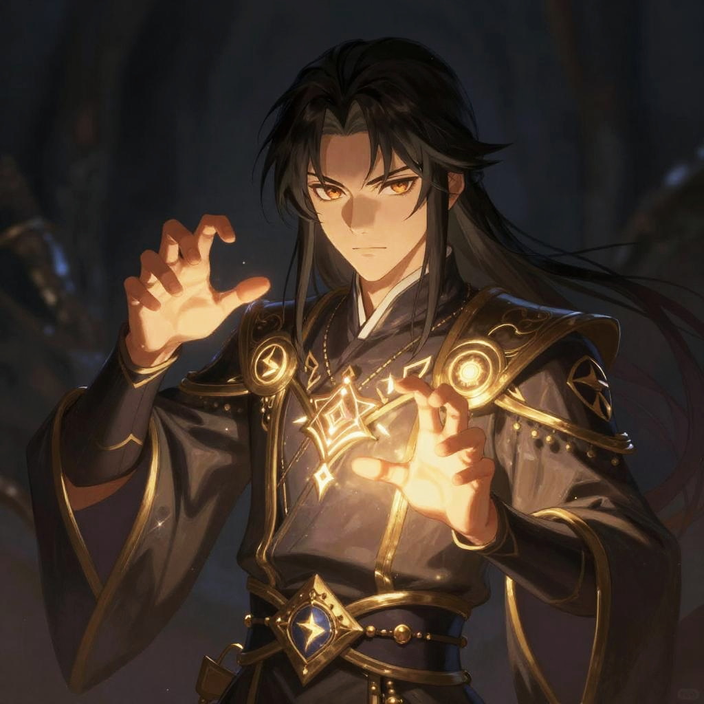 Semi realistic anime portrait of a mystical mage casting a glowing spell, intricate costume designs with luminous runes, soft glowing effects around hands, detailed eyes showing intensity and magic, balanced composition with atmospheric lighting in digital painting style.