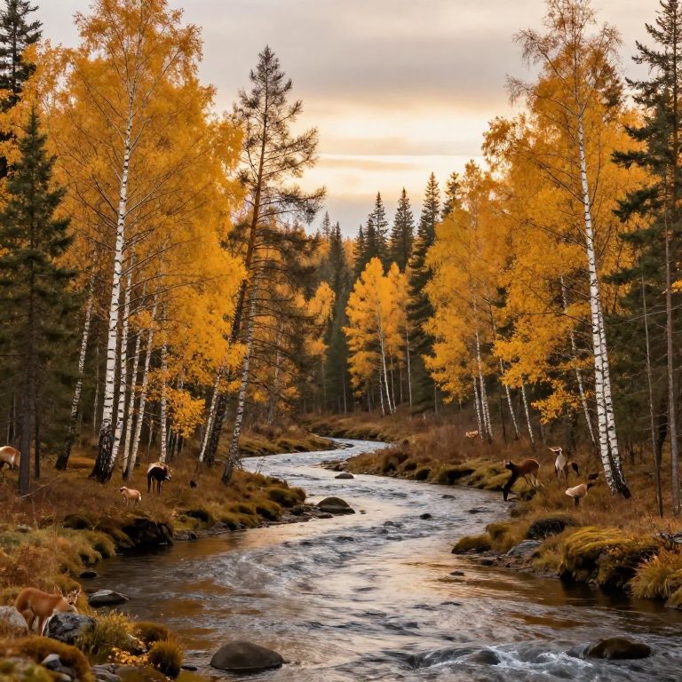 Scandinavia wilderness in autumn, vast birch and pine forests with golden leaves, a gentle river flowing through, wildlife like elk and foxes, soft diffused sunset light, painterly and naturalistic aesthetic