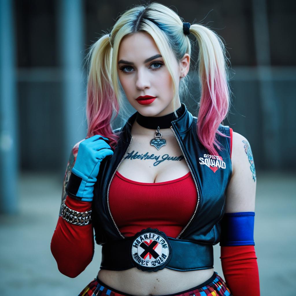Photoshoot of Ariana Grande as Harley Quinn, editorial fashion, magazine-style, high resolution, 8K, detailed.