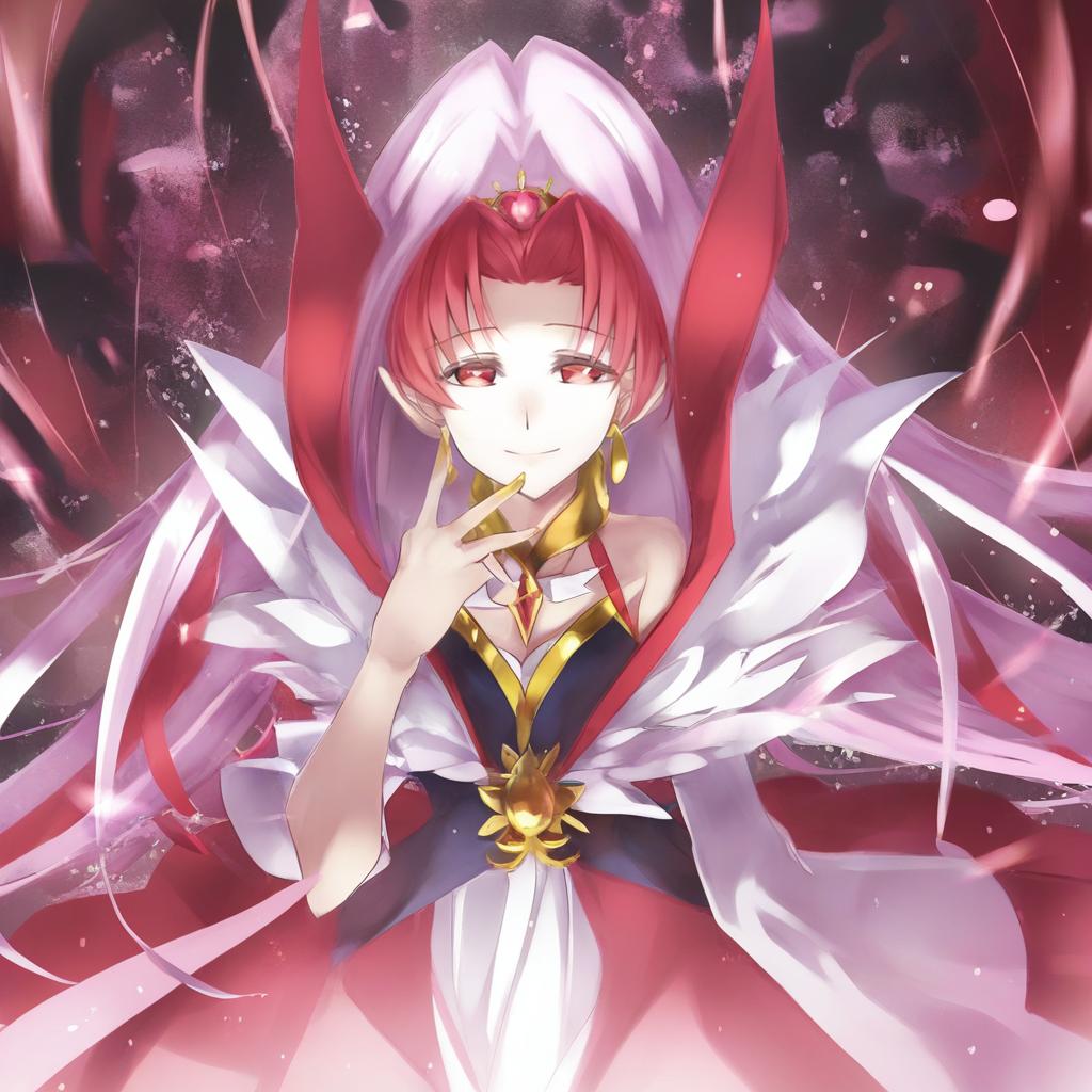 Digital artwork of a magical girl character with red eyes, a mix of red, pink, and white long hair styled in quad tails. She has pointy ears, wearing a detailed costume with white, red, and gold accents including a prominent sun-shaped brooch and matching earrings. The background is a soft blend of pink and dark tones with abstract light effects.