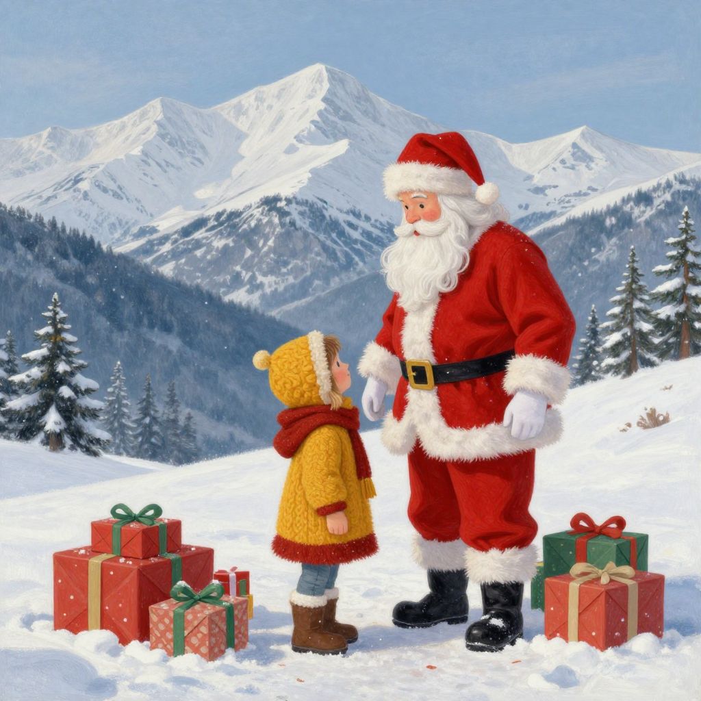 Superimpose Santa into photo of a snowy mountain landscape, serene and peaceful, with Santa Claus standing beside a warmly dressed child, surrounded by wrapped presents in the snow, evoking a heartwarming winter holiday scene, painterly and rich in color.