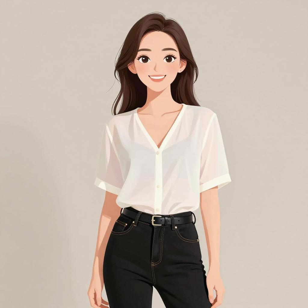 Woman with pretty face and pretty hair. smiling Woman, casual chic, semi-sheer white blouse with V-neckline, short cuffed sleeves, casual front tuck into black high-waisted jeans, slim leather belt with small metallic buckle, plain studio background. --sref 1467