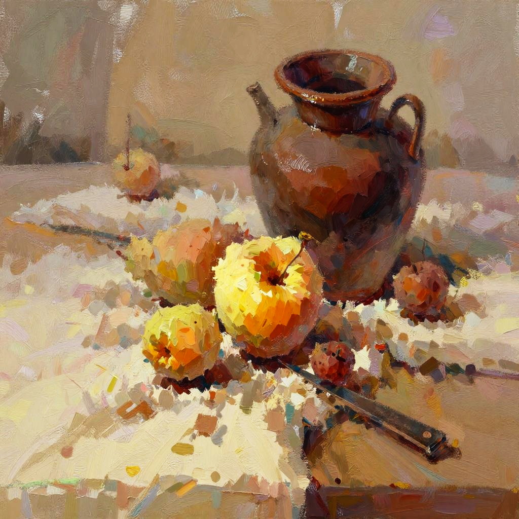 Create oil painting from photo of a classic still life arrangement, focusing on ripe fruits and rustic pottery, warm earthy tones with visible brush textures, traditional oil painting style with depth and realism, softly blended shadows and highlights