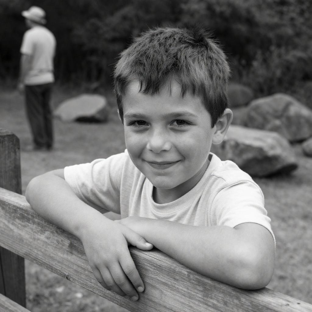 Black and white photo of a young boy with short dark hair, wearing a light-colored shirt, smiling slightly while leaning on a wooden fence. In the blurred background, a man wearing a hat stands near a forested area with scattered large rocks.