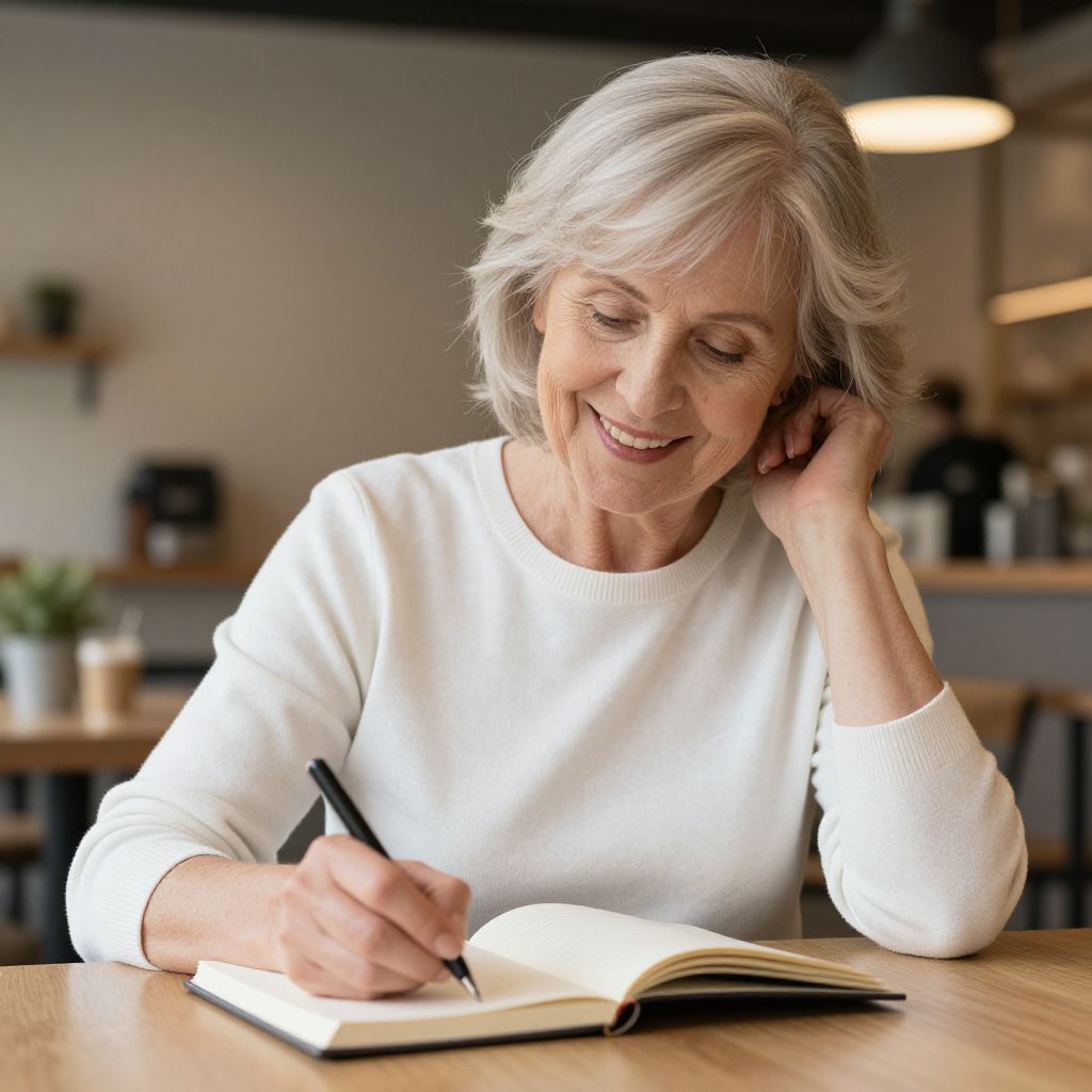 Photograph of an elderly woman with short, gray hair, wearing a beige sweater, sitting in a cozy café. She is smiling warmly while writing in an open book with a black pen in her right hand, resting her chin on her left hand. A white cup and saucer are on the wooden table in front of her. The background is slightly blurred, showing a chalkboard menu and another person sitting at a table. Warm, soft lighting enhances the intimate café atmosphere.