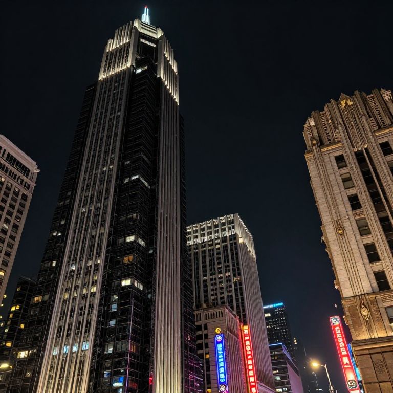 The image depicts a futuristic cityscape at night, characterized by a blend of Art Deco and Modernist architectural styles. The left side of the image showcases a towering skyscraper with a ziggurat-like structure, clad in sleek black marble and featuring a stepped profile that exudes power and grandeur. The building's geometric shapes and streamlined forms reflect the dystopian aesthetic of the film. The street-level architecture is equally striking, with intricate masonry and ornamentation that hark back to the Art Deco era. Neon signage adorns many buildings, lending the cityscape a colorful, almost otherworldly quality. The overall composition creates a highly stylized, surreal version of a dystopian future, where humanity's relationship with technology has resulted in a world that is simultaneously beautiful and terrifying.