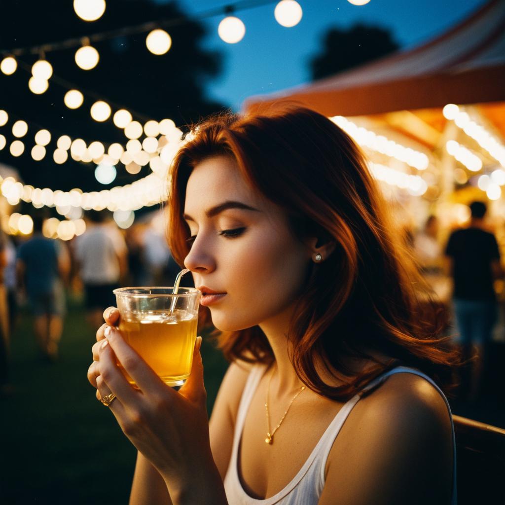 A stunning auburn-haired woman with fair skin drinks jasmine tea through a straw at an outdoor summer night fair. The ambient warm golden light and large bokeh elements create a serene and cozy atmosphere. She wears a white tank top, a delicate gold necklace, and small stud earrings. The background shows blurred lights and fair attendees, emphasizing the lively yet intimate setting.