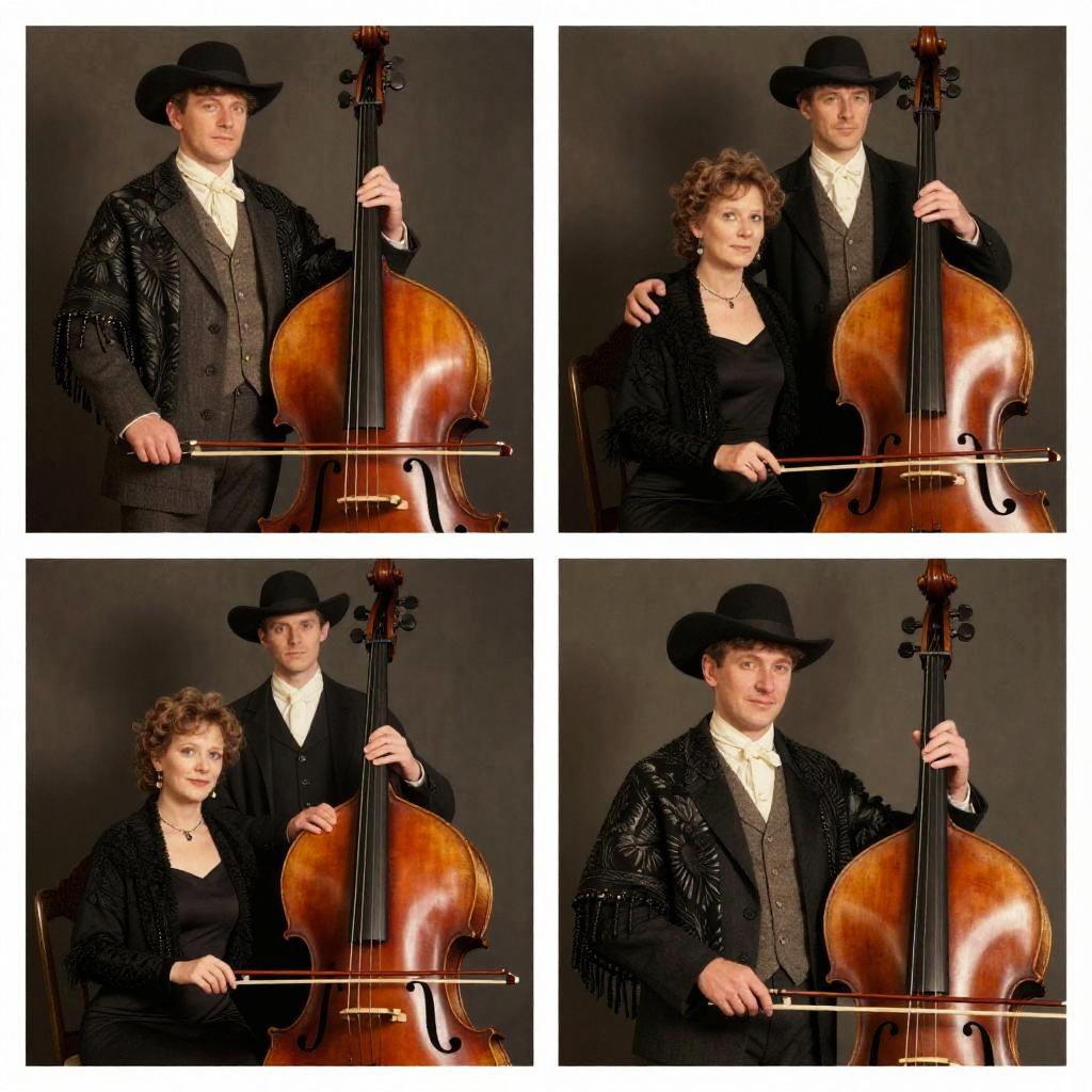 This is a collage of four vintage-style photographs featuring a couple in different outfits and poses with a double bass. The top left shows them standing, top right has them sitting, bottom left has them seated at a table, and bottom right shows a close-up of them holding the double bass. The background is dark, and they wear 19th-century-style clothing, including a black hat and shawl.