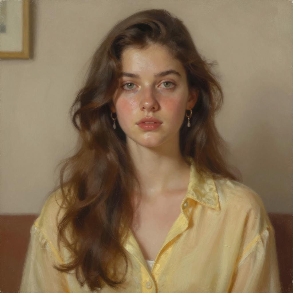Digital art painting of a 30-year-old woman psychoanalyst seated on a vintage sofa in a psychoanalyst office. She wears a black suit and has symmetrical, defined facial features with a calm and composed expression. The room is decorated with framed paintings on the wall, a wooden desk with papers, and classic office furniture. The lighting is dramatic, emphasizing the subject's face and posture.