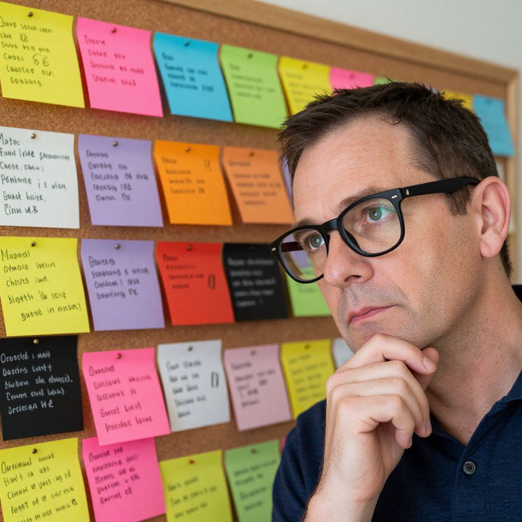 Photograph of a Caucasian man with short brown hair and black-framed glasses, wearing a black polo shirt, thoughtfully resting his chin on his hand. He is positioned to the right of the image, looking slightly to the left. Behind him is a corkboard covered with colorful sticky notes in various shades of yellow, pink, blue, green, and black, each with handwritten notes. The background is slightly blurred, emphasizing the man's contemplative expression and the vibrant, organized notes. The lighting is bright, highlighting the man's face and the notes' colors.